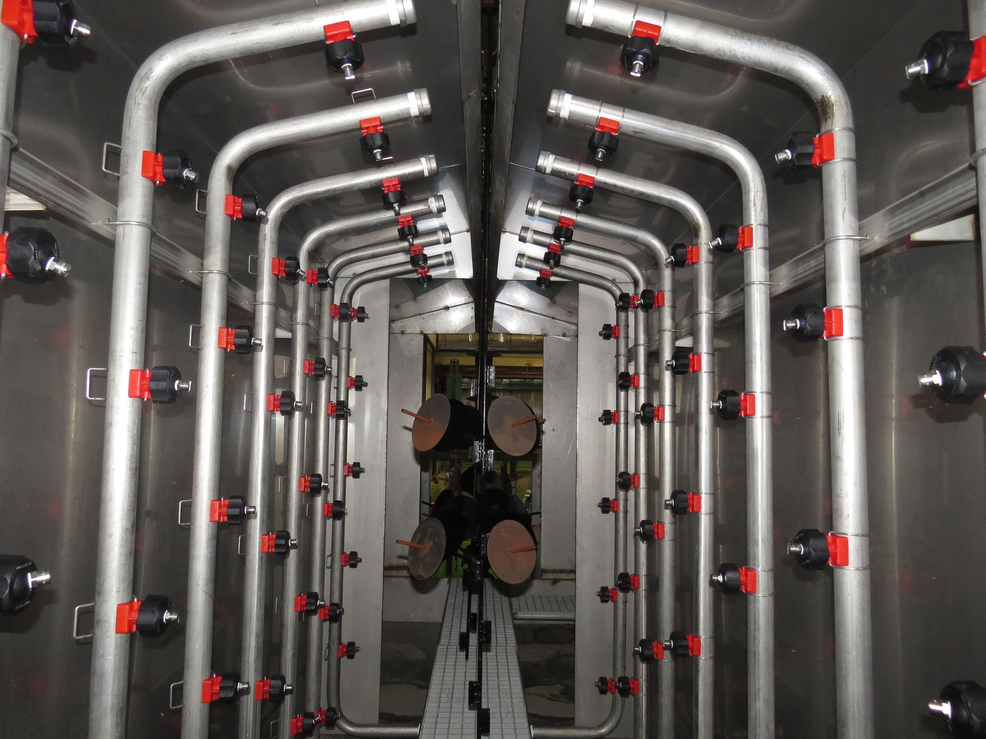 In the Spray Pre-Treatment process, there are sequential arrangement of spray zones in a tunnel according to the designed chemical process time required. The Tunnel is mounted on support Structures, tanks containing chemicals from where the chemicals are pumped up to the spray zones through the Headers and Risers, through Spray Nozzles.